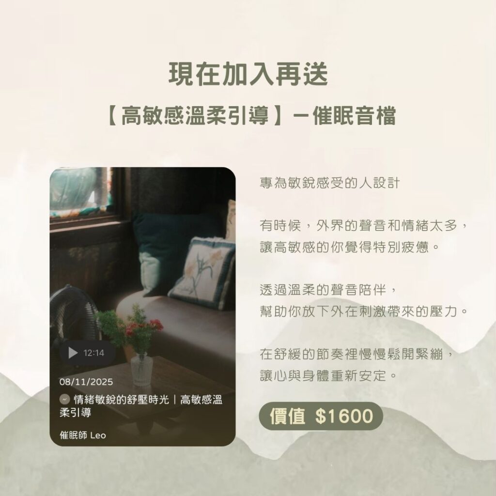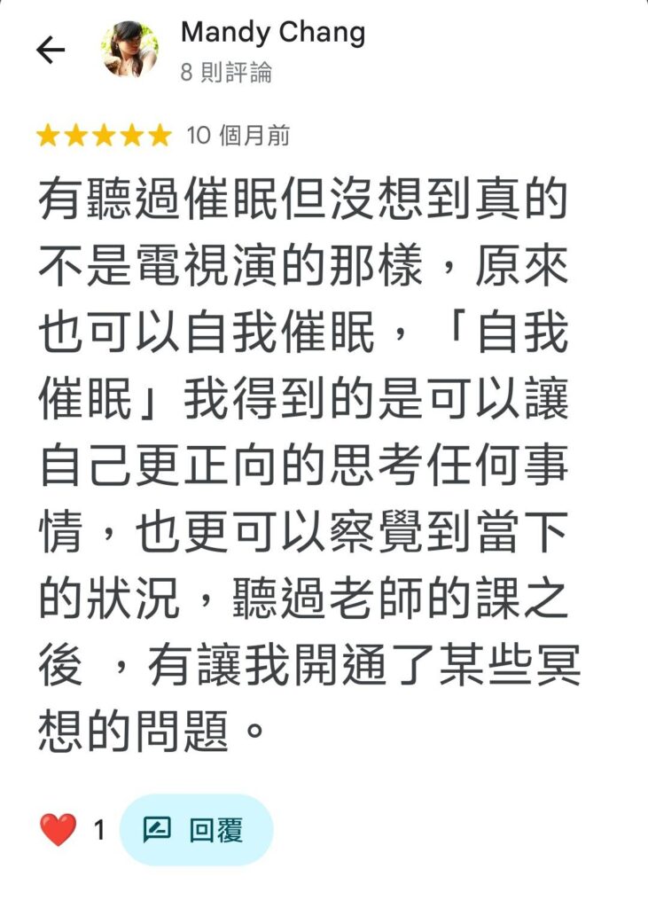 🌿 自我催眠入門課 🌿讓催眠成為你的日常調整工具 你對催眠好奇嗎? 它不是電影裡的「失去意識、任人擺佈」而是一種能幫助你放鬆、專注、調整狀態的技巧這堂課,將帶你認識真正的自我催眠讓催眠成為你日常可用的內在工具! NT238 馬上加入學習 學員心得 五星好評 5.0 探索內在力量,你只缺這一堂課! 為什麼你懂很多道理卻還是不知道如何與自己相處? 2 小時帶你掌握,與自己相遇的自我催眠技巧! 如果你常常想:「我好像不太了解自己」「情緒來了,不知道怎麼安放」「想要更溫柔地對待自己,卻不知道怎麼開始」 這堂 「2HR 自我催眠入門課」會幫助你開始溫柔對待自己 💡 你將帶走一套可隨時啟動的內在工具,幫助你在日常中活得更自在、更有力量。 NT238 馬上加入學習
