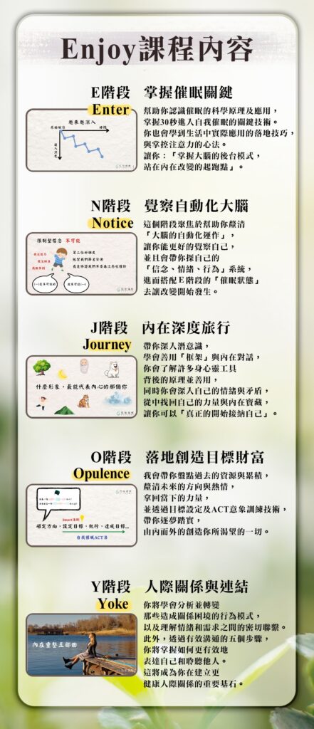在退伍之後,我投入了催眠的深入學習,不僅取得了多間國際機構的催眠導師資格,還考取了ACHE Clinical Hypnotherapist,期待透過ENJOY生活提案,和你分享所有「催眠自助」的技巧與心法,一起走向喜歡的那個自己。
